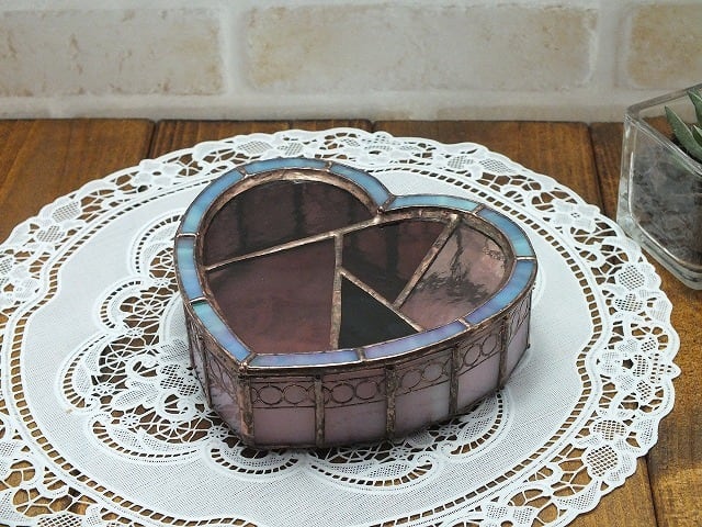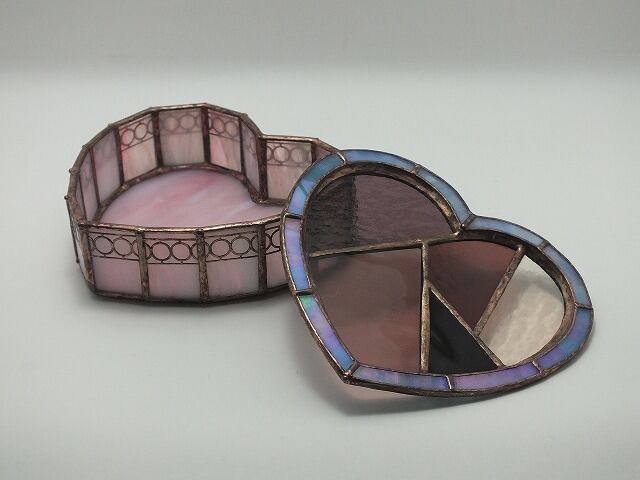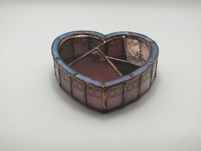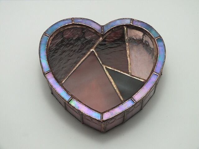 ピンク系のガラスで作られたハート型、蓋つき小物入れのステンドグラスボックスです。
