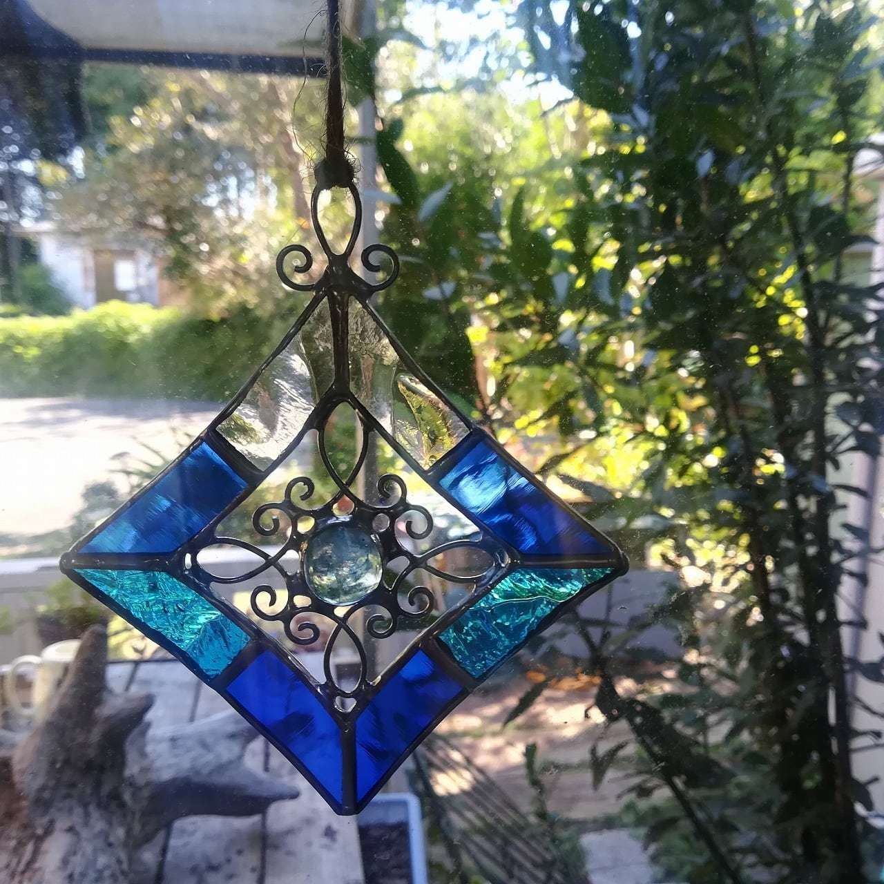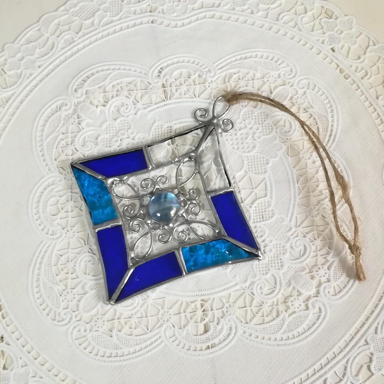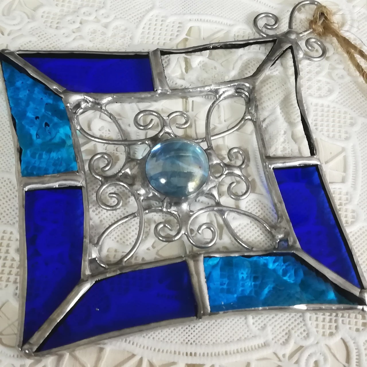 手作りの装飾ワイヤーとブルー系のナギットガラスを中央に配置し、ブルーとターコイズブルー、クリアガラスを組み合わせて作ったステンドグラスのサンキャッチャーです。