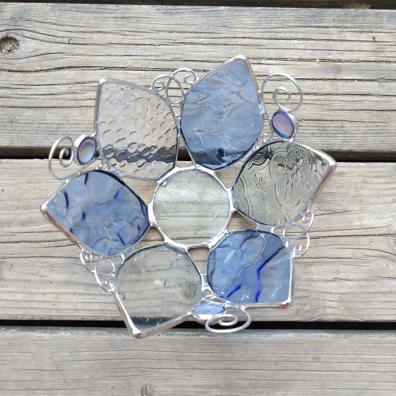 アクセサリー用に作っている淡いラベンダーのナギットガラスを装飾として使用しております。アクセントとして施している装飾ワイヤーは1.2㎜の銅線を加工したものです。