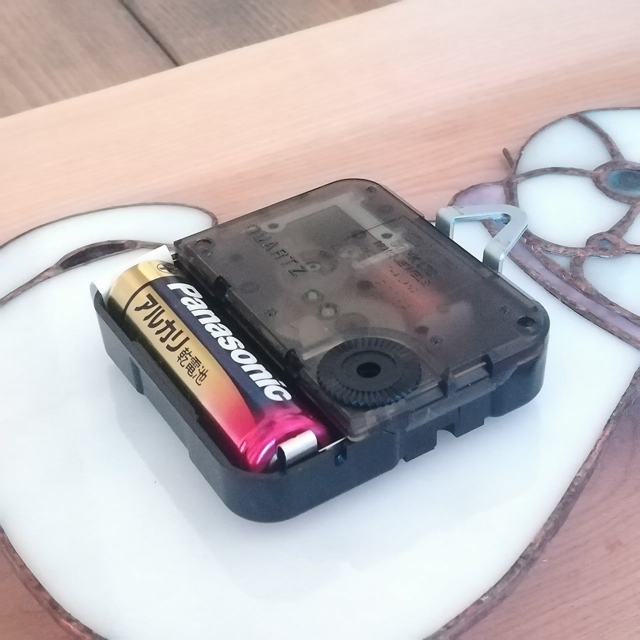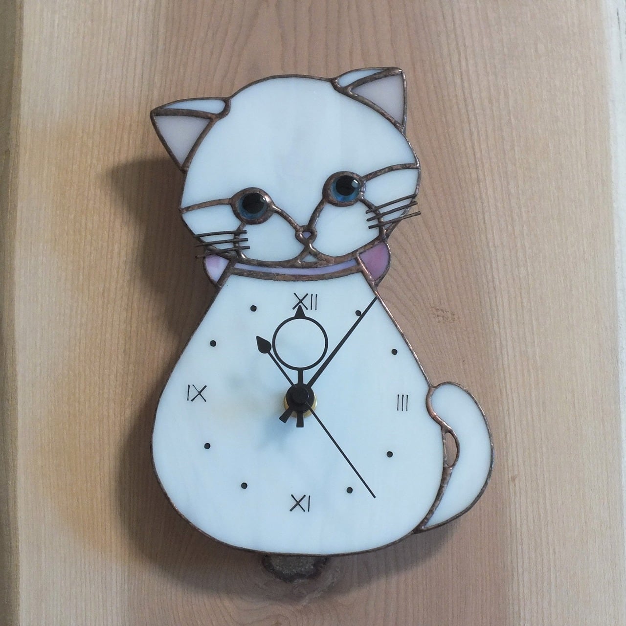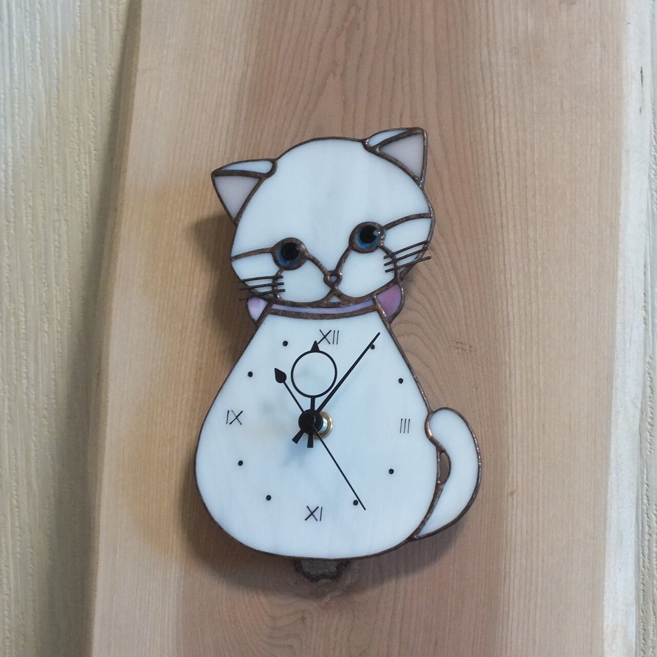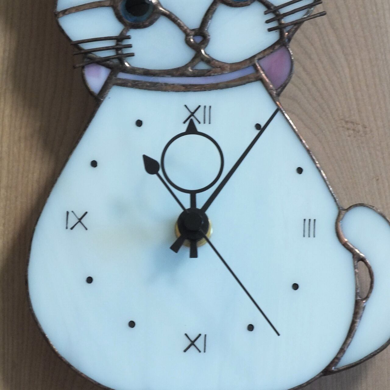 ステンドグラスで制作した白猫の時計です。