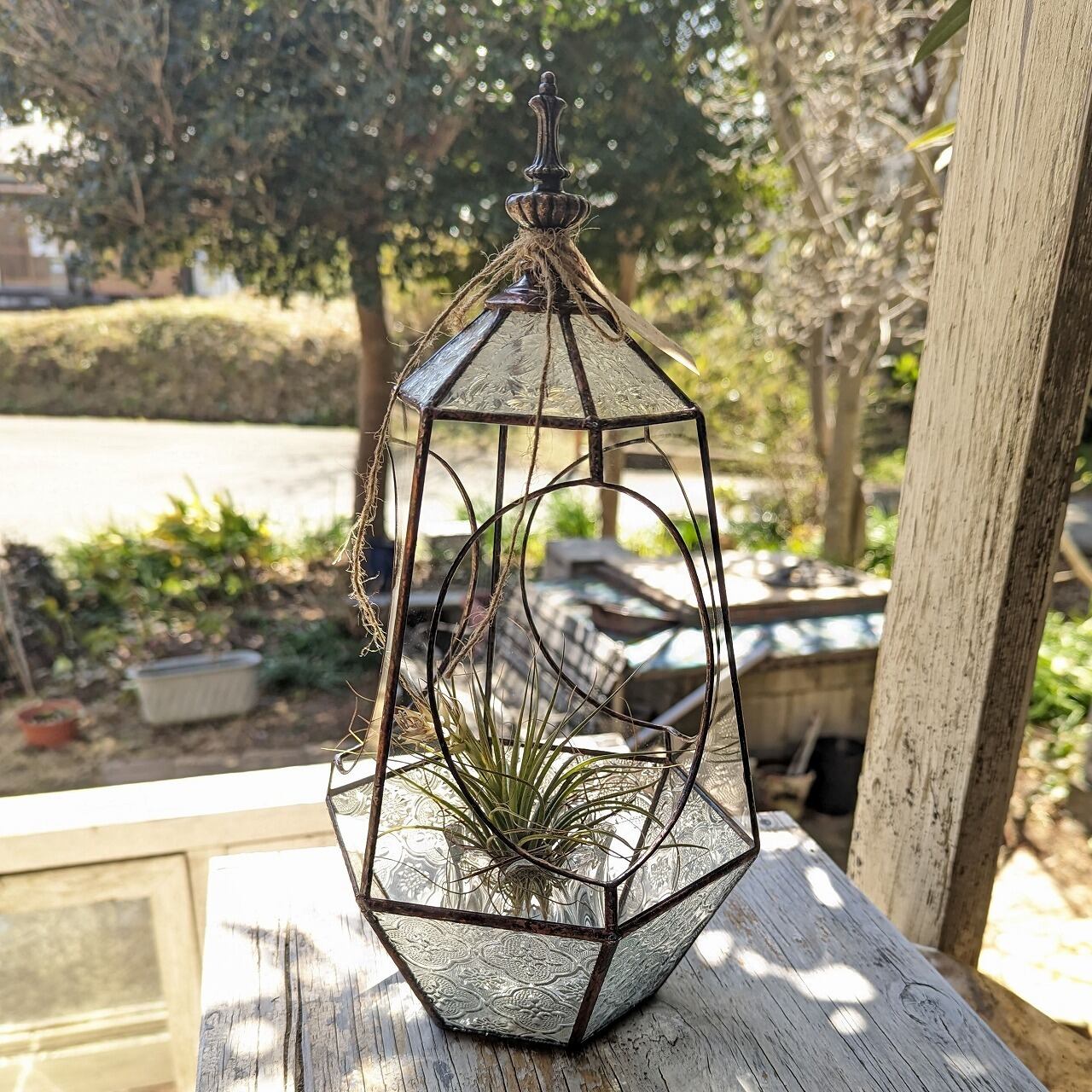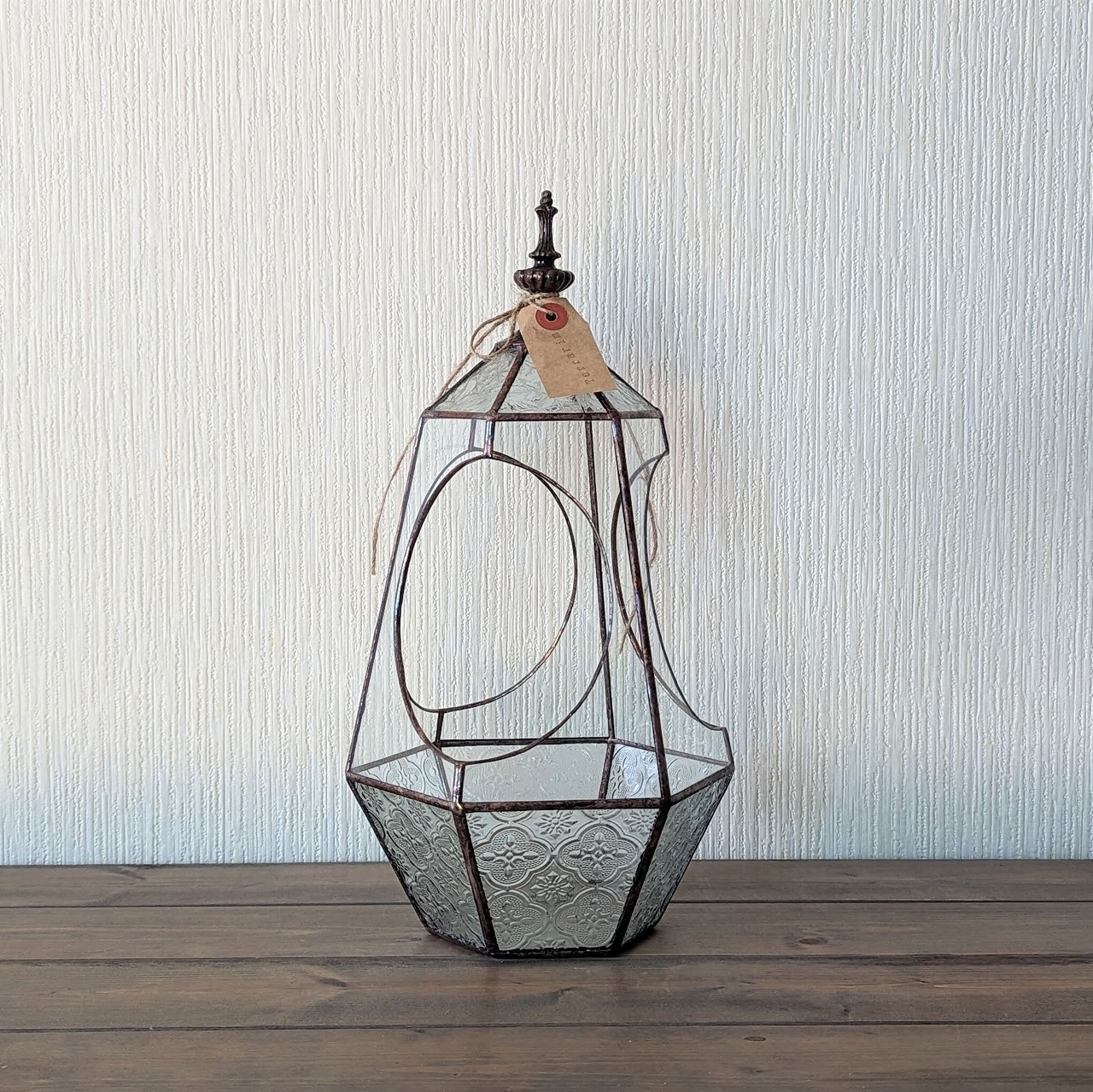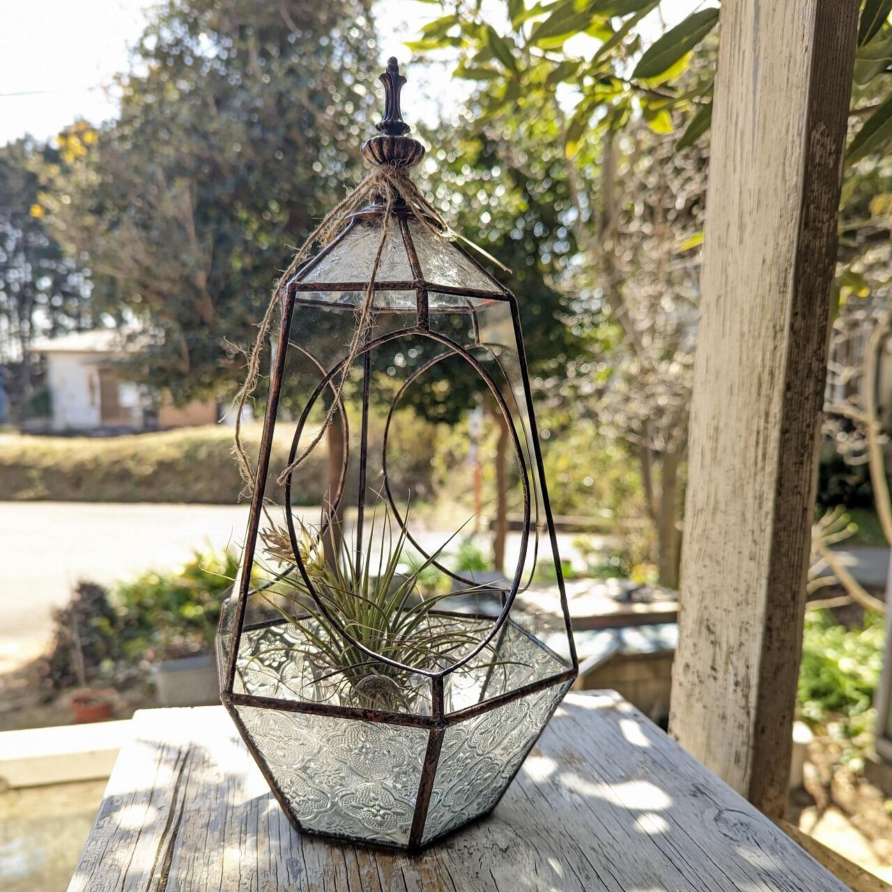 こちらのテラリウムは3段組、オーバル(長円形)窓が等間隔に3箇所空いており、クリアガラスとフローラガラスと呼ばれる太陽光でキラキラと光るテキスチャのガラス、少し古美のあるアンティーク調の色合いの仕上げが大きな特徴となっております。
