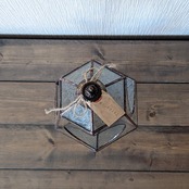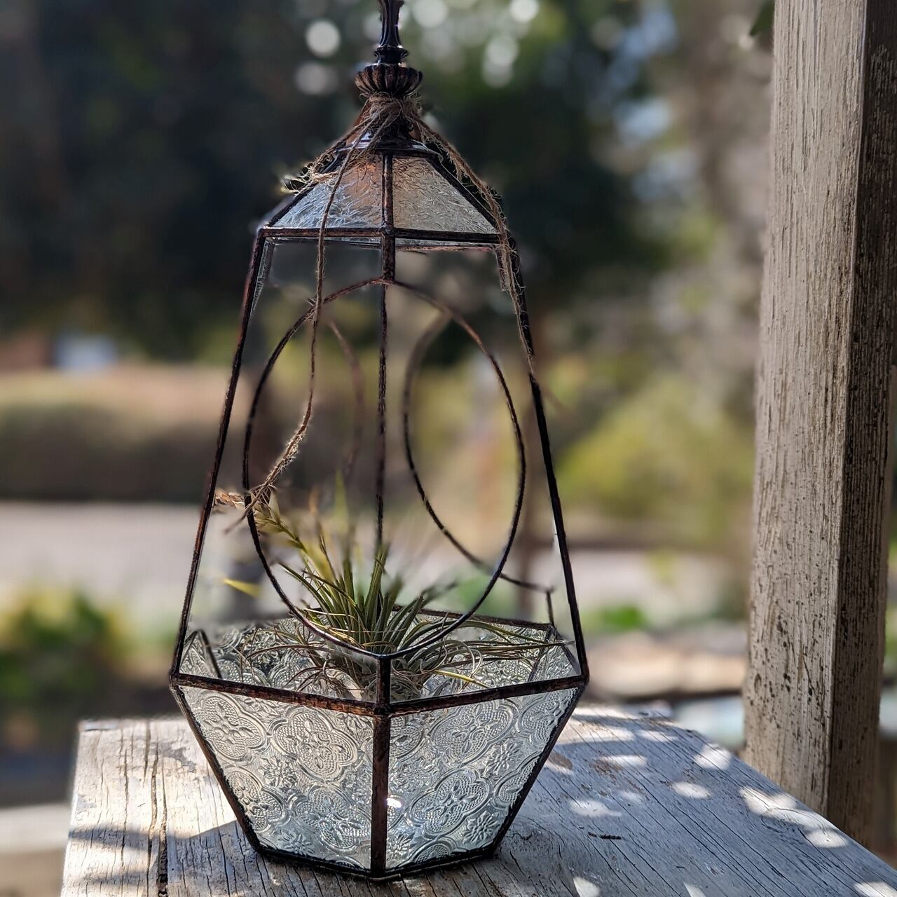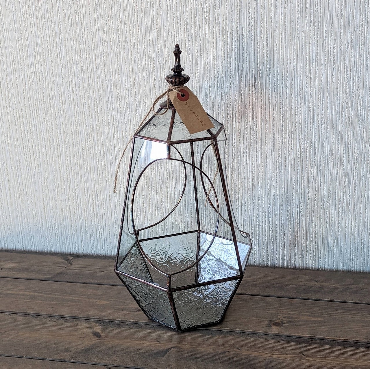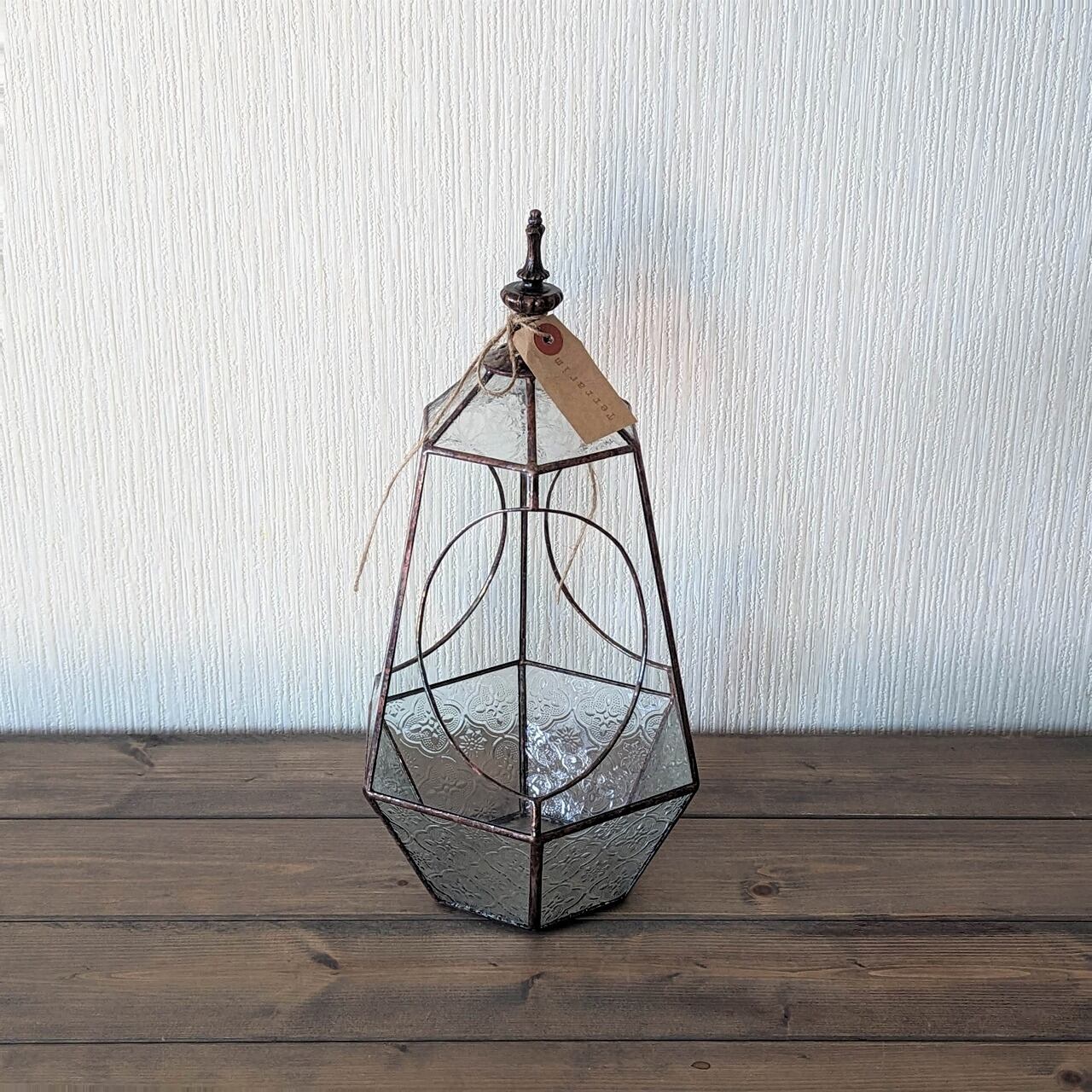 こちらのテラリウムは3段組、オーバル(長円形)窓が等間隔に3箇所空いており、クリアガラスとフローラガラスと呼ばれる太陽光でキラキラと光るテキスチャのガラス、少し古美のあるアンティーク調の色合いの仕上げが大きな特徴となっております。