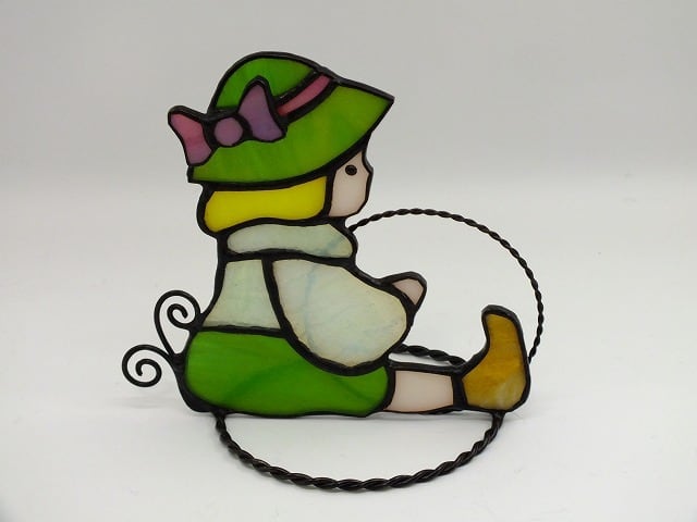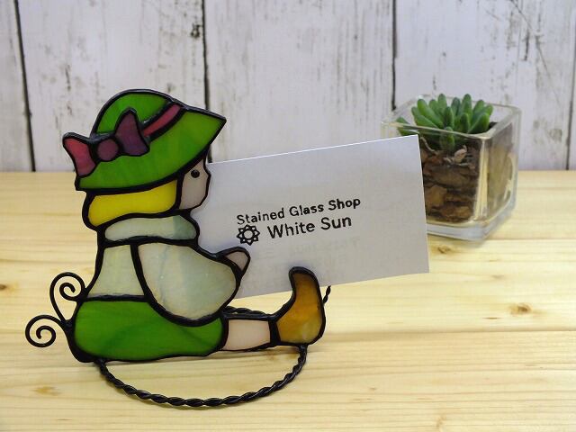 かわいい帽子の女の子のステンドグラスカードスタンドです。カードをはさみこんで使用します。ポストカード等少し大き目の物でも大丈夫です。