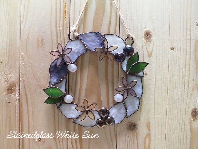 ステンドグラスで作ったフラワーデザインのリースです。白と紫のガラスをベースに光沢のある紫のナギットガラスや白のナギットガラス、ピンクの花や淡黄色の花、イエローグリーンの葉で構成してみました。はんだ面をアンティーク色にして落ち着いた感じに仕上げています。